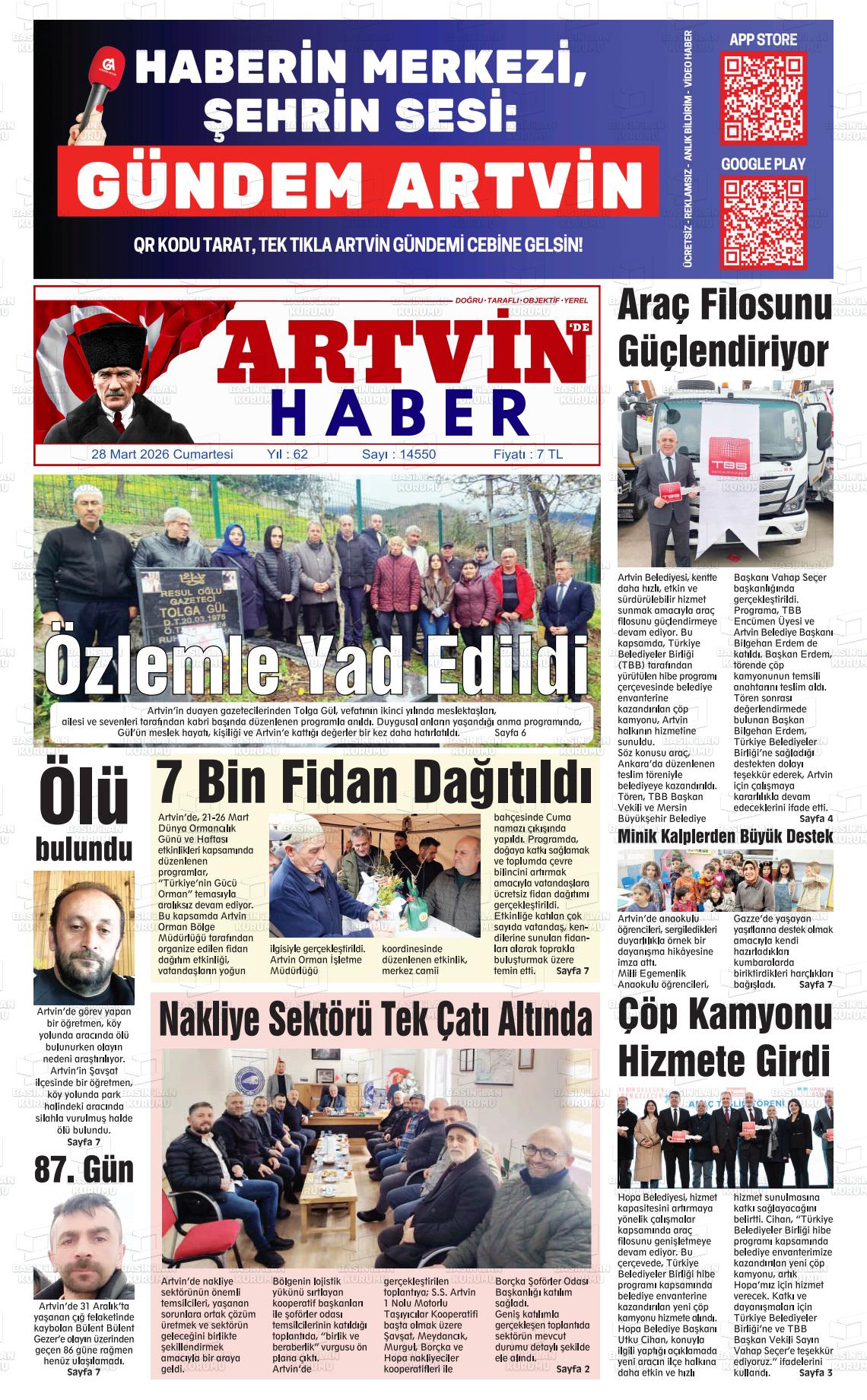 Artvİn Yerel Gazeteleri 28 Mart 2026, Cumartesi Günü Manşeti