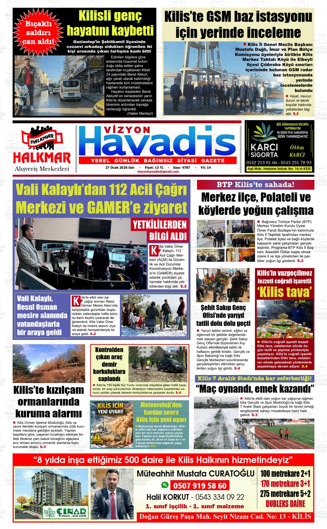 Kİlİs Yerel Gazeteleri 28 Ocak 2026, Çarşamba Günü Manşeti