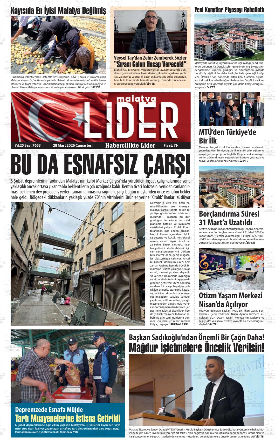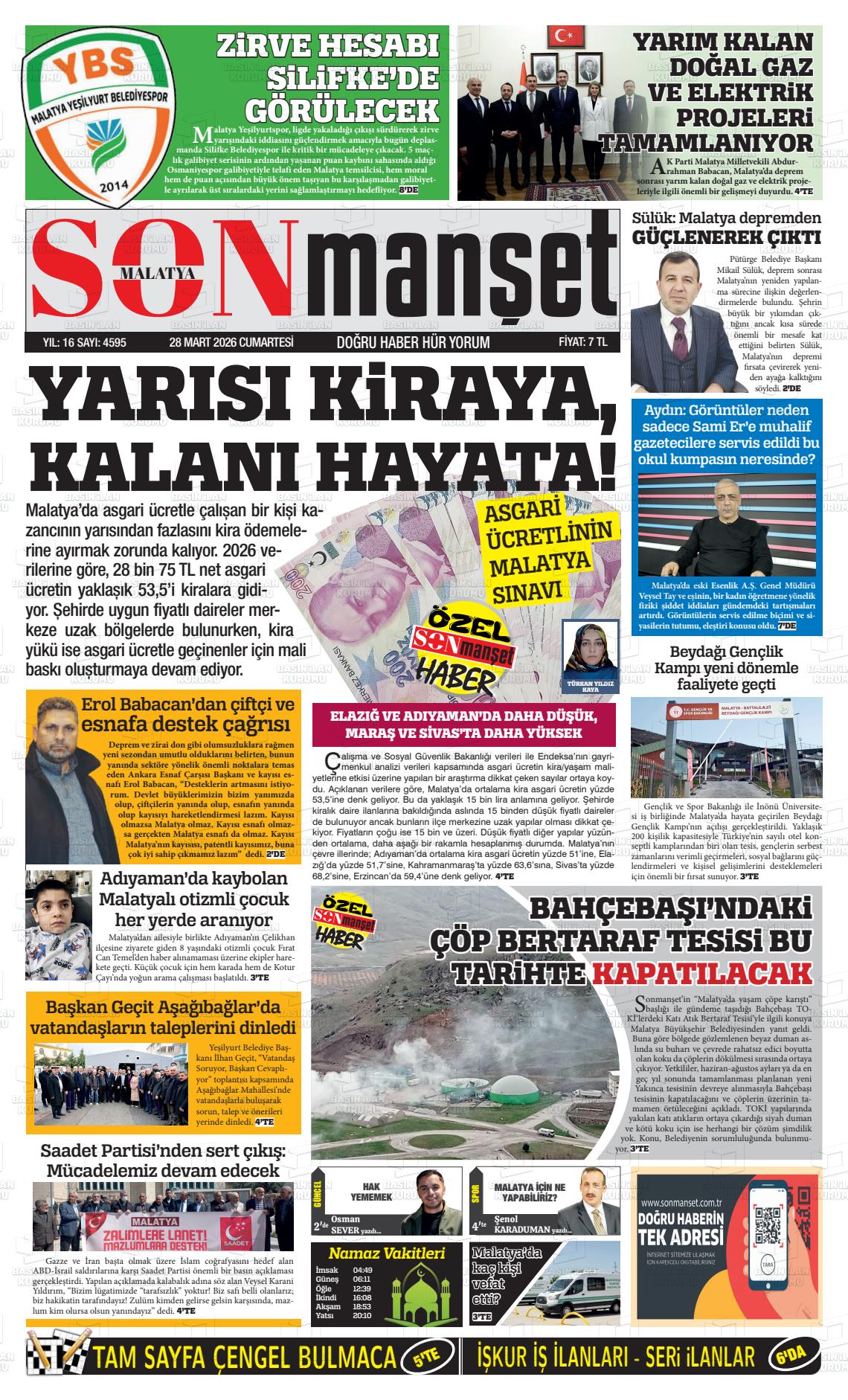 Malatya Yerel Gazeteleri 29 Mart 2026, Pazar Günü Manşeti