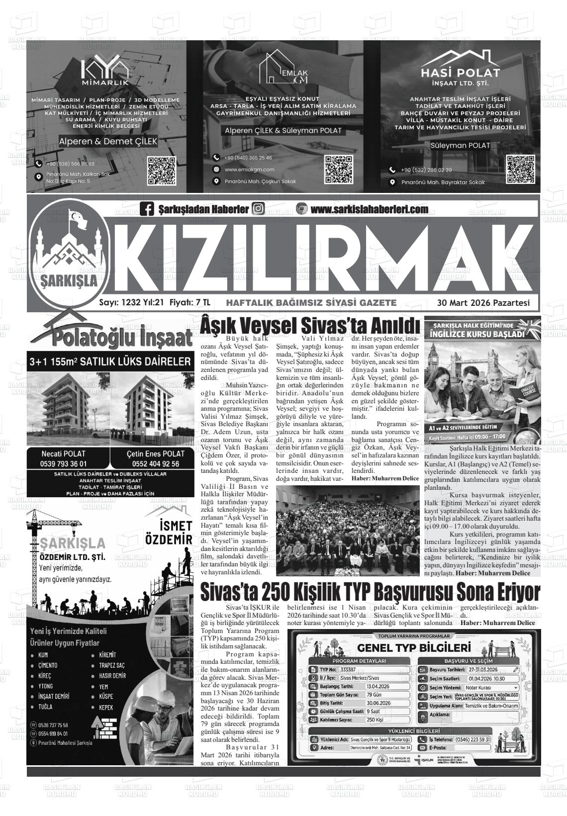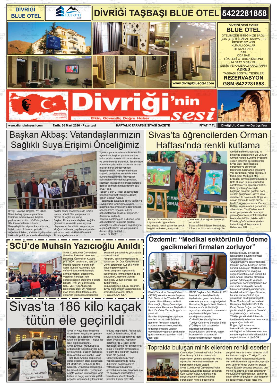 Sİvas Yerel Gazeteleri 30 Mart 2026, Pazartesi Günü Manşeti